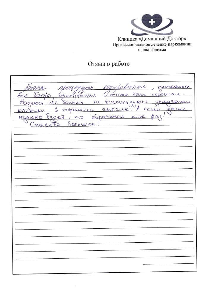 Я выбрал кодирование на 3 года, и это решение оказалось правильным. Алкоголь больше не контролирует мою жизнь, и я чувствую себя значительно лучше. Благодарю за шанс вернуться к нормальной жизни.